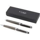 Promotional Pacific Duo Pen Gift Set with stylus. Exclusive design pen set featuring a stylus ballpoint pen and rollerball pen with premium black ink refill. A soft rubber stylus tip is integrated into the end cap of ballpoint pen and eliminates fingerprints and smudges on your smartphone or tablet. Compatible with any capacitive touchscreen device. Also ideal for everyday use with public touchscreens such as ATM or retail payment pads. Incl. premium black ink refill and presented in a ''LUXE'' gift box. MOQ: 50 Lead time: 3 weeks Colours available: granite Branding options: pad printed up to 4 colours