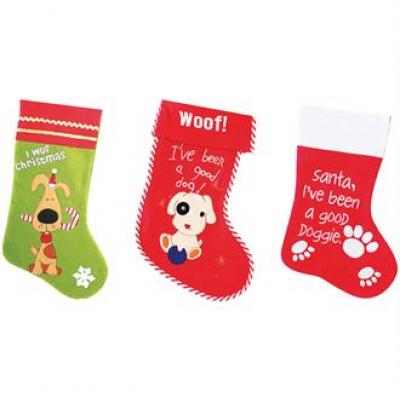 Printed Dogs Stocking. Pets Christmas Stocking – Dogs, 3 designs. Green Stocking with Red Band - 'I Wuf Christmas' Text and dog with Candy Cane visual. Red Stocking with Red oversized Band and white stitching – 'I've been a good dog!' and 'Woof' text with white dog visual. Red stocking with white band – 'Santa, I've been a good doggie' text with white paw print visual.