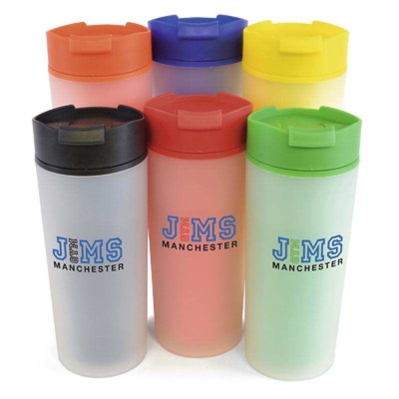 Promotional Frosted Double Walled Travel Mug Express Printed. 500ml double walled, PP plastic tumbler with frosted exterior and coloured anti-spill screw top lid with secure sipper. BPA & PVC Free.