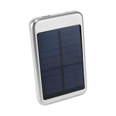 Promotional Solar Powered Power Bank With Flashlight. Outdoor solar charger with built-in light functionality. This 8000 mAh power bank has a rechargeable Lithium battery and can charge your smartphone or mobile device wherever you are. Thanks to the solar panel, it will charge itself when exposed to sun or daylight. 21 LED lights will turn this device in to a flashlight when needed. An ideal gift for adventurers and camping enthusiasts. Includes an USB-cable and micro-USB plug. Size 14,2x7,6x2,2 cm.