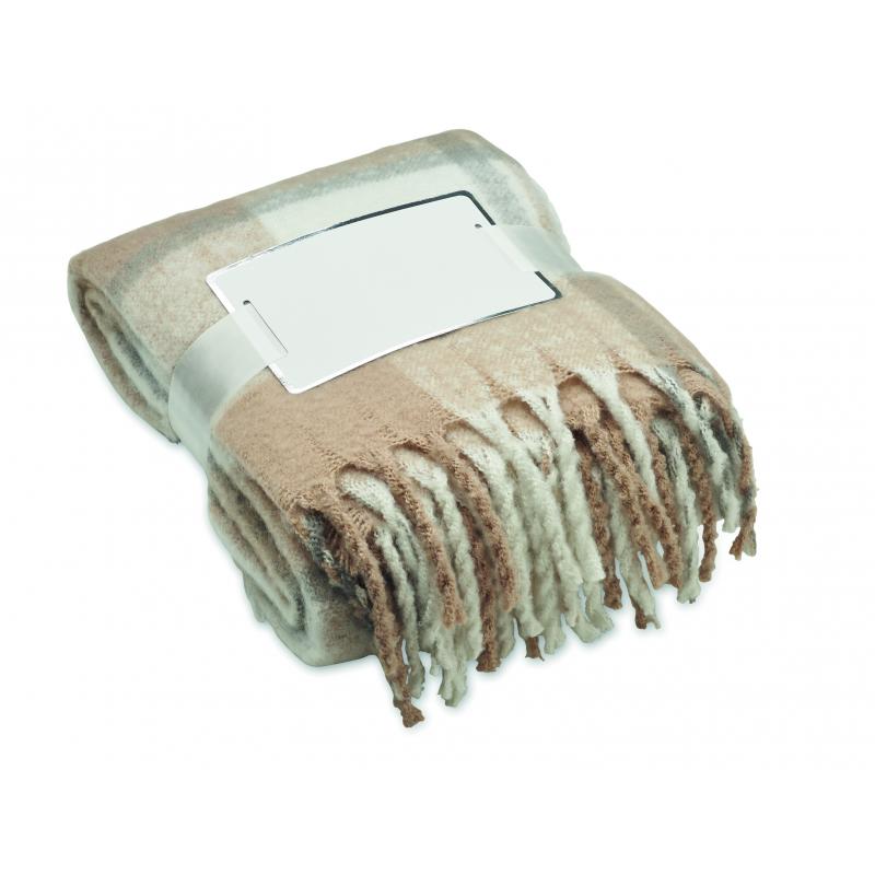 Promotional Recycled Beige Mohair Chequered Blanket. A beautiful cosy blanket for chilly winter evenings.
