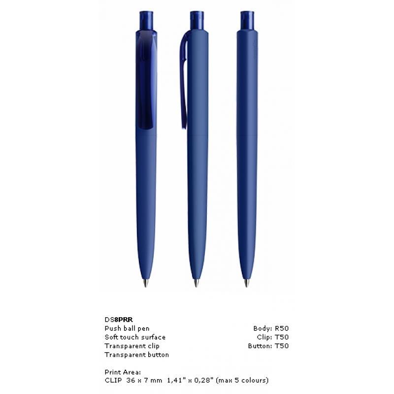 New Promotional Prodir DS8 Pens, Printed Prodir DS8 Pens in Soft Touch finish Blue. Brand new promotional pens by prodir with ergonomic design.Available in vibrant colours and Matt, Polished, Varnished, and soft touch feel. The icon of a classic writing instrument. A timeless interpretation of the triangular form in an ergonomically optimised design. Functional right down to the last detail. Relaxed writing with a self-confident, high-quality ballpoint pen. Contact promobrand for a free product visual. Available with metal chrome or satin push button options.