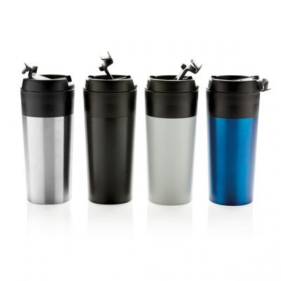 Printed Stainless Steel Flip-Lid Travel Mug, Reusable Coffee Cup. Stainless steel tumbler with flip-lid. Inner body is made out of plastic. Spill proof and hand wash only. Content 480ml. MOQ: 50 Lead time: 3 weeks Product size: 18.8 x 8.3 cm Product weight : 223gr Capacity: 480m;l Colours available: black, white, silver, blue