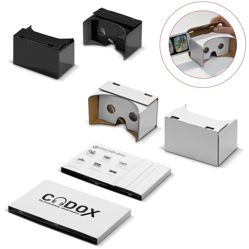 Cheap Promotional Cardboard VR Glasses - Printed VR Glasses in Black or White. These Cardboard Virtual Reality Glasses are an ideal cheap option for entering the world of Virtual Reality! A simple yet functional and effective design makes these Cheap Printed VR Glasses easy to use and the perfect product for mass promotions. With a large print area, with up to 4 spot colour printing, you can be sure your branding won't be missed and the user will always remember where their VR Glasses came from! Contact us for the best prices and free visuals on our Cheap Printed Cardboard VR Glasses, Available in black or white