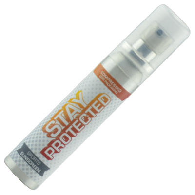 Promotional Sunscreen In Spray Bottle. Full colour printed sun lotion in 25ml spray bottle. This promotional sunscreen has a SPF of 20. The spray bottle is made in the UK from recycled material and is fully recyclable. A ideal give away for promotions with in the tourist trade, summer events, festivals, and health resorts.