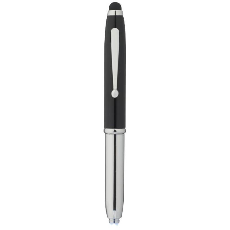 Xenon stylus ballpoint pen with LED light. Stylus ballpoint pen with single LED flashlight and removable cap. Batteries included. Aluminium.