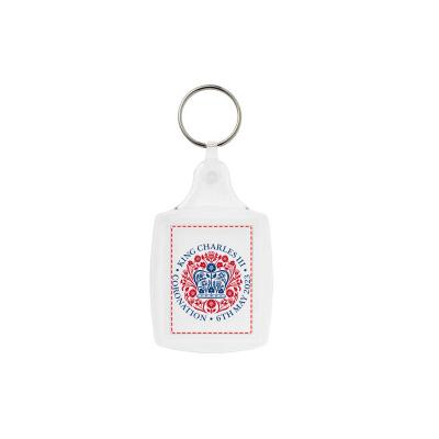 Printed King Charles Coronation Keyring UK Made. Clear rectangular E1 keychain with metal split keyring. The metal looped ring offers a flat profile which is ideal for mailings. Print insert dimensions: 4,5 cm x 3,5 cm.